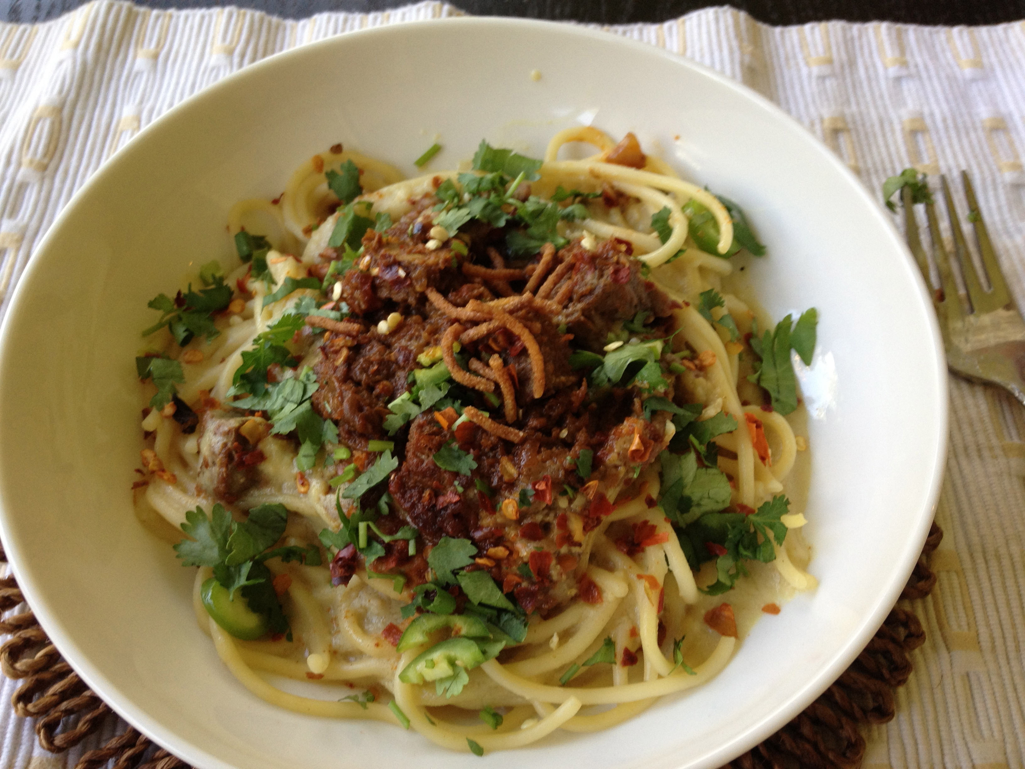 Assembling the perfect bowl can be challenging, a handful of noodles, a tablespoons of the beef curry (or more), a few tablespoons of the coconut curry with garnishes of green chillies, corriander, red chilli flakes and fried noodles.